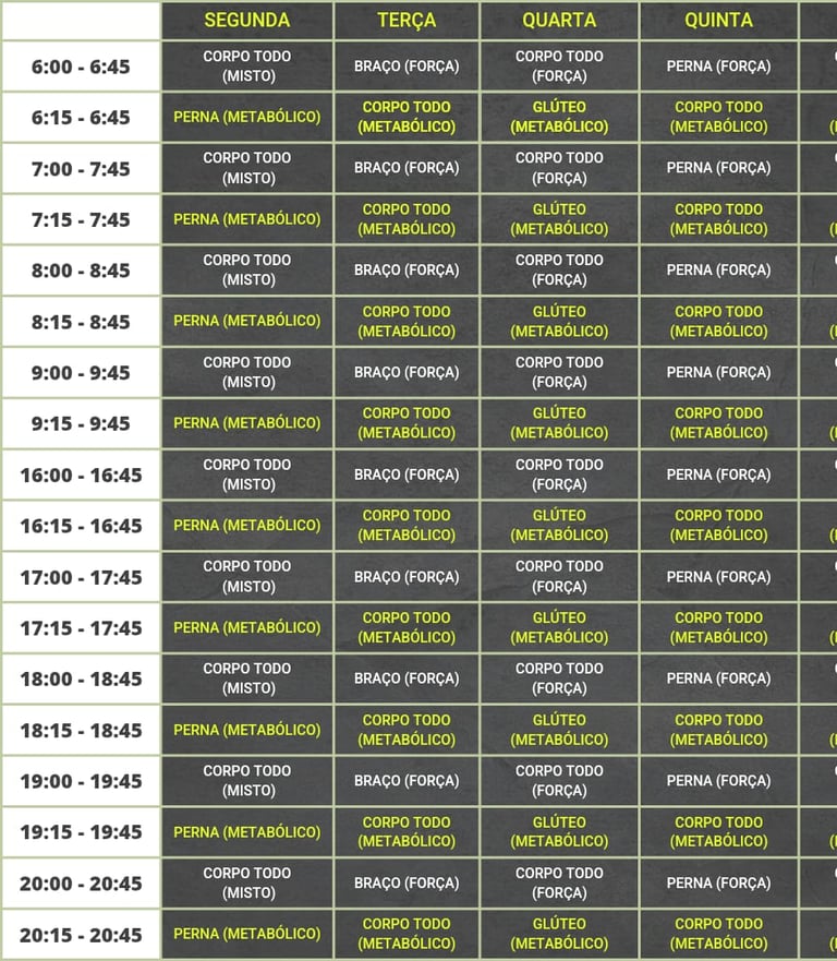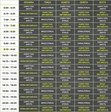 Confira abaixo os horários que temos disponíveis. Caso você deseje, podemos agendar uma aula experimental gratuita antes de decidir se realmente deseja fazer o plano.